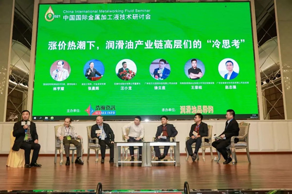 會議最后特邀國務院特殊津貼技術專家、教授級高工林亨耀老師、行業資深專家高工張晨輝老師、安美科技汪小龍董事長、方川潤滑科技徐立庶總經理、科萊恩大中華區王榮桂銷售經理、鉑索新材料趙志強總經理圍繞“漲價潮”、“碳中和”等議題展開開放式討論,共謀潤滑產業變革新路徑,共話金屬加工發展新未來。