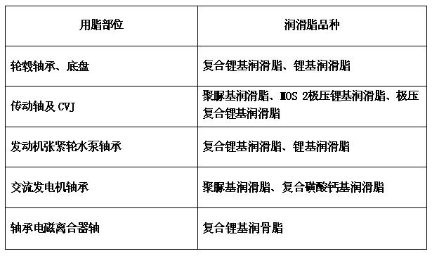 目前汽車用脂部位及所用潤滑脂品種如下: