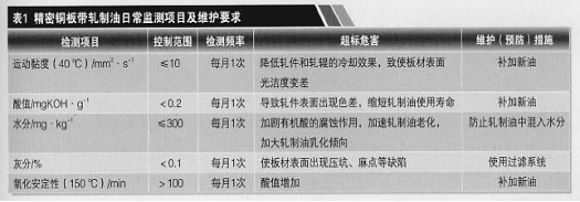 為了確保精密銅板帶軋制油的使用性能,良好的日常監控和維護十分重要。這不僅有利于延長精密銅板帶軋制油的使用壽命,降低成本,而且有利于板材的表面質量和精度。精密銅板帶軋制油的常規性能指標包括運動黏度、閃點、傾點、水分、灰分、酸值、銅片腐蝕、餾程、最大無卡咬負荷、氧化安定性等,其日常監測項目及維護要求見表1,換油指標要求見表2 。
