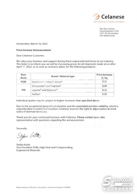 3月16日,塞拉尼斯發布調價通知函稱,將從4月1日起,提高公司部分系列POM(聚甲醛)、TPE(熱塑性彈性體)價格,最高漲幅高達400美元/噸!
