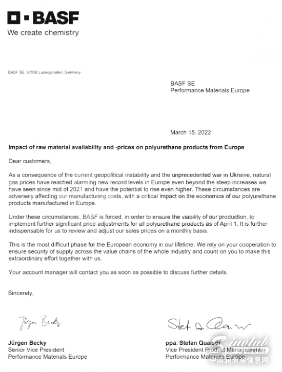 3月15日,巴斯夫發布客戶溝通函,將從4月1日起,對歐洲市場所有聚氨酯產品實施進一步價格調整。