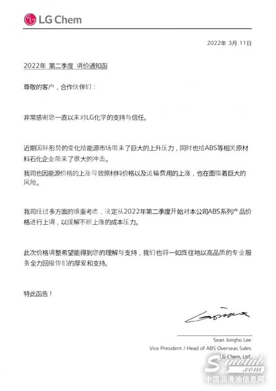 LG化學調價通知函稱,受國際形勢及能源上漲影響,自第二季度開始,公司將針對ABS系列產品進行提價!