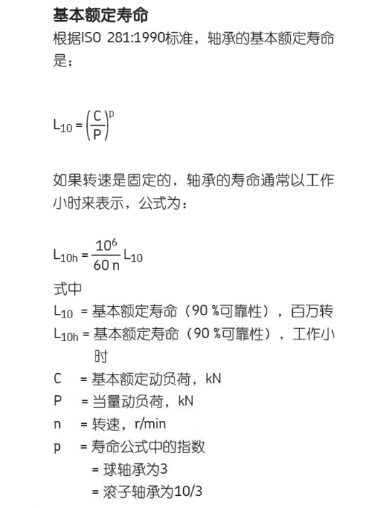 要明白,軸承的基本額定壽命就是考核軸承的耐操程度,一般給出90%可靠性的理論計(jì)算壽命。僅有這個(gè)公式可能還不夠,比如SKF或NSK可能會(huì)給出各種修正系數(shù)。
