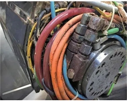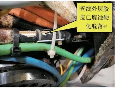 設備廠家維修拆開主軸內部發現,各種電氣管線都附著一些黃褐色物質,金屬表面已出現銹蝕現象,部分電氣管線外層膠皮已腐蝕硬化脫落,個別管線內部已進入切削液,故障分析之后發現與切削液有關。因為主軸管線內部結構復雜且腐蝕程度已造成故障隱患,需要對管線整體進行更換,但機床配件進口周期較長,造成長時間停機維修,損失較大。