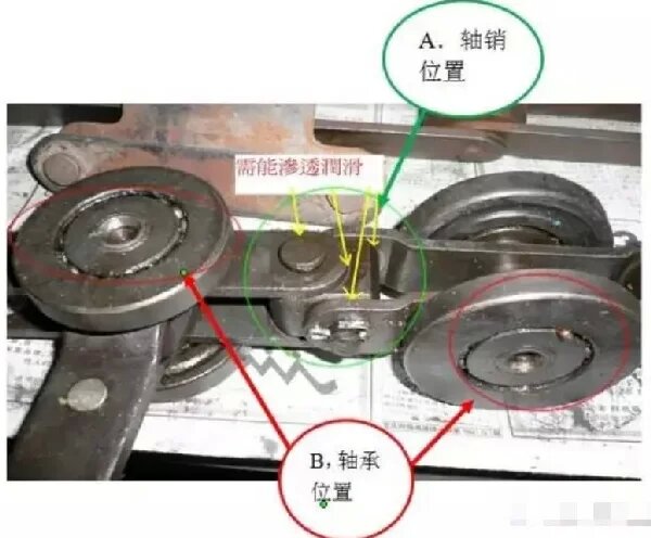 鏈條的潤滑關鍵點為鏈轂與鏈軸之間,這也是最易發生磨損的部位,它會導致鏈條拉長;根據鏈條制造商的規定,當鏈節的拆除長度超過總長的5%時鏈條報廢;無正確潤滑的鏈條壽命不超5年,潤滑良好的鏈條可工作15~20年。