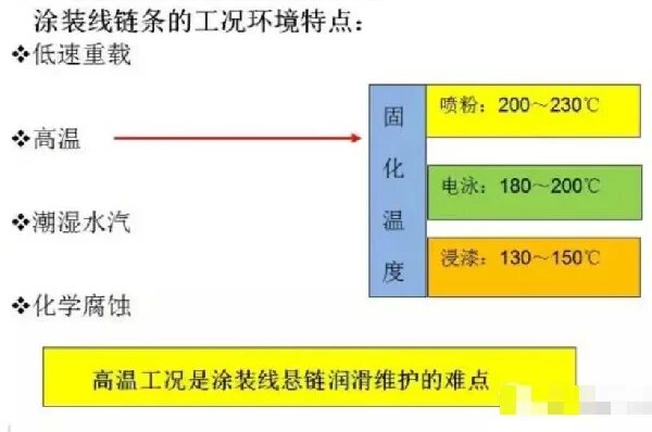 工件表面涂漆后,要進入烘爐烤漆,也就是說,懸掛輸送鏈需要反復進入高溫區,每次進入高溫區的時間約幾十分鐘。這就要求鏈條用潤滑劑應滿足: